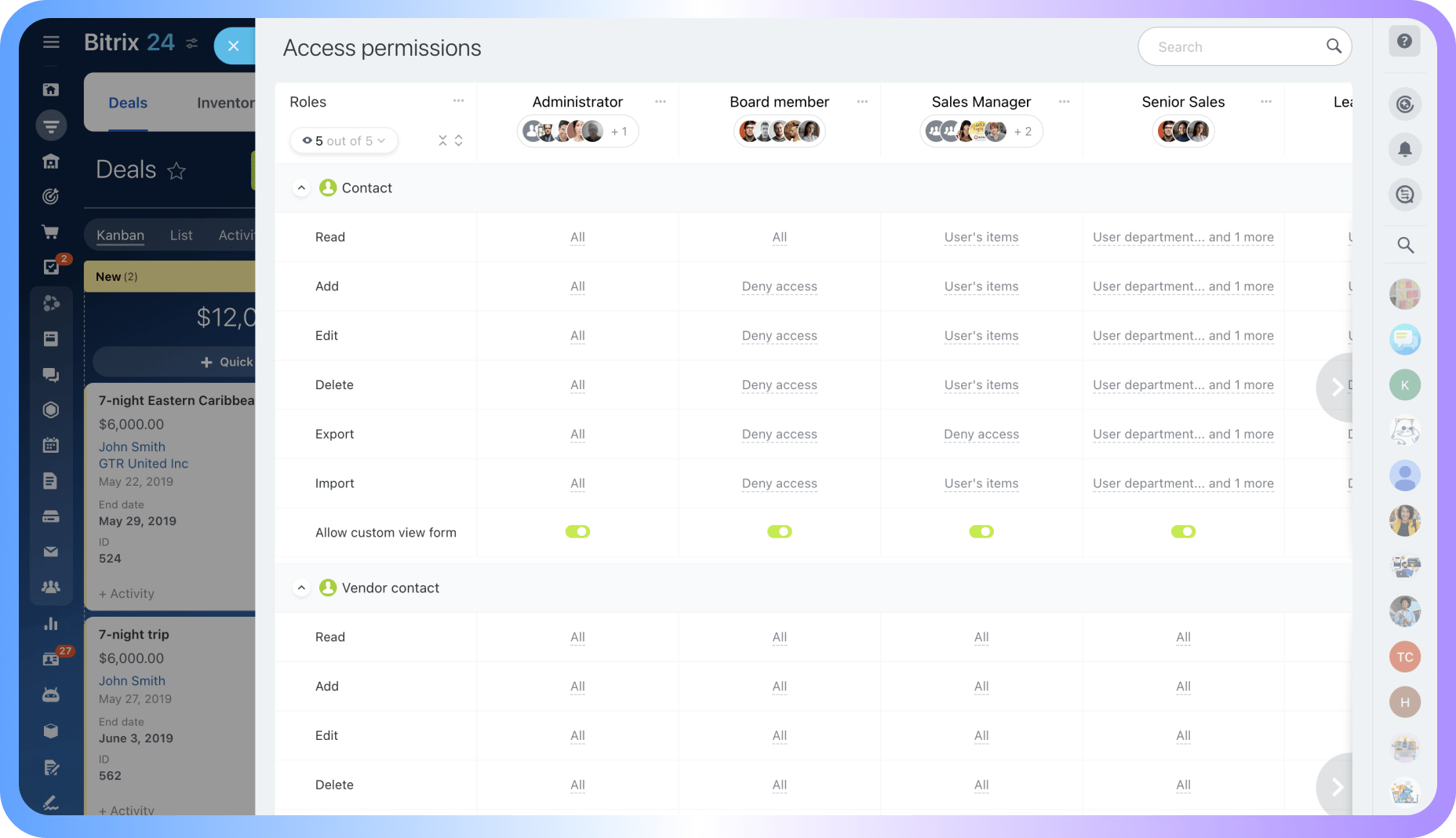 Ahora puedes asignar permisos de acceso en el CRM basados en el rol de un empleado (representante de ventas, gerente de departamento, administrador), restringiendo su capacidad para ver, editar o modificar elementos del CRM.