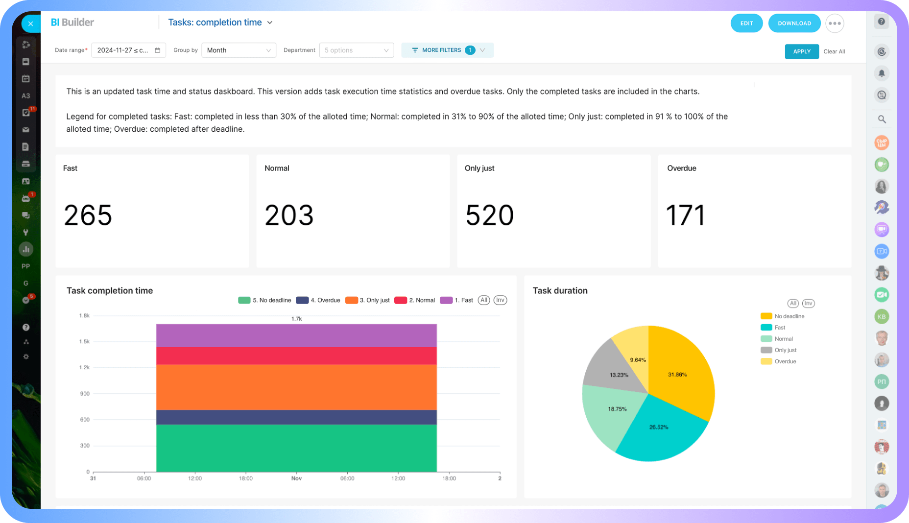 Nuevos paneles están disponibles ahora en BI Builder: crea informes sobre la eficiencia de los empleados y su participación en tareas. Además, ahora puedes cargar tus propios datos en formato CSV en BI Builder.